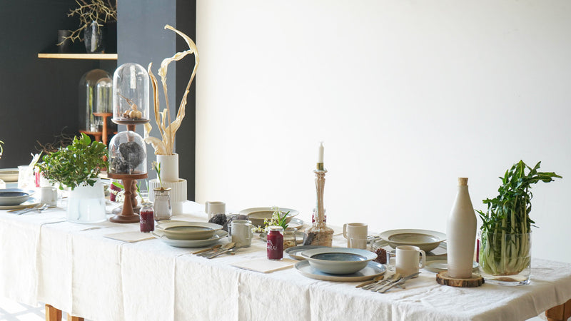 フラワーアーティストの梶谷奈允子さん(以下 “奈允子さん”)と、料理家の橋本彩子さん(以下、“彩子さん”)のコラボレーションによる企画「花と料理」。そのイベントに、TIMELESS COMFORTより、Homelandのテーブルウェア、エプロンなどをお貸出しさせていただきました。