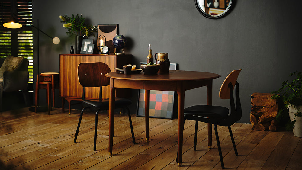 XANDER DESIGNS(サンダーデザイン)シリーズの、JULIE ROUND EXTENSION DINING TABLEがリニューアルしました。見た目にはほぼ変わりありませんが、無垢材だった天板を突き板に。それにより無垢材ならではの経年変化による反りや歪み、割れなどが起きにくくなり、より扱いやすくなりました。ただし、天板のエッジと脚部は以前と同じく無垢材を使用。エッジに触れた時の柔らかい肌触りや風合いはそのまま、日々の暮らしに寄り添うとても扱いやすいテーブルになっています。色&素材は、写真のシックなダークブラン色のポプラ材と、明るくナチュラルな色のホワイトオーク材の2種類が揃います。