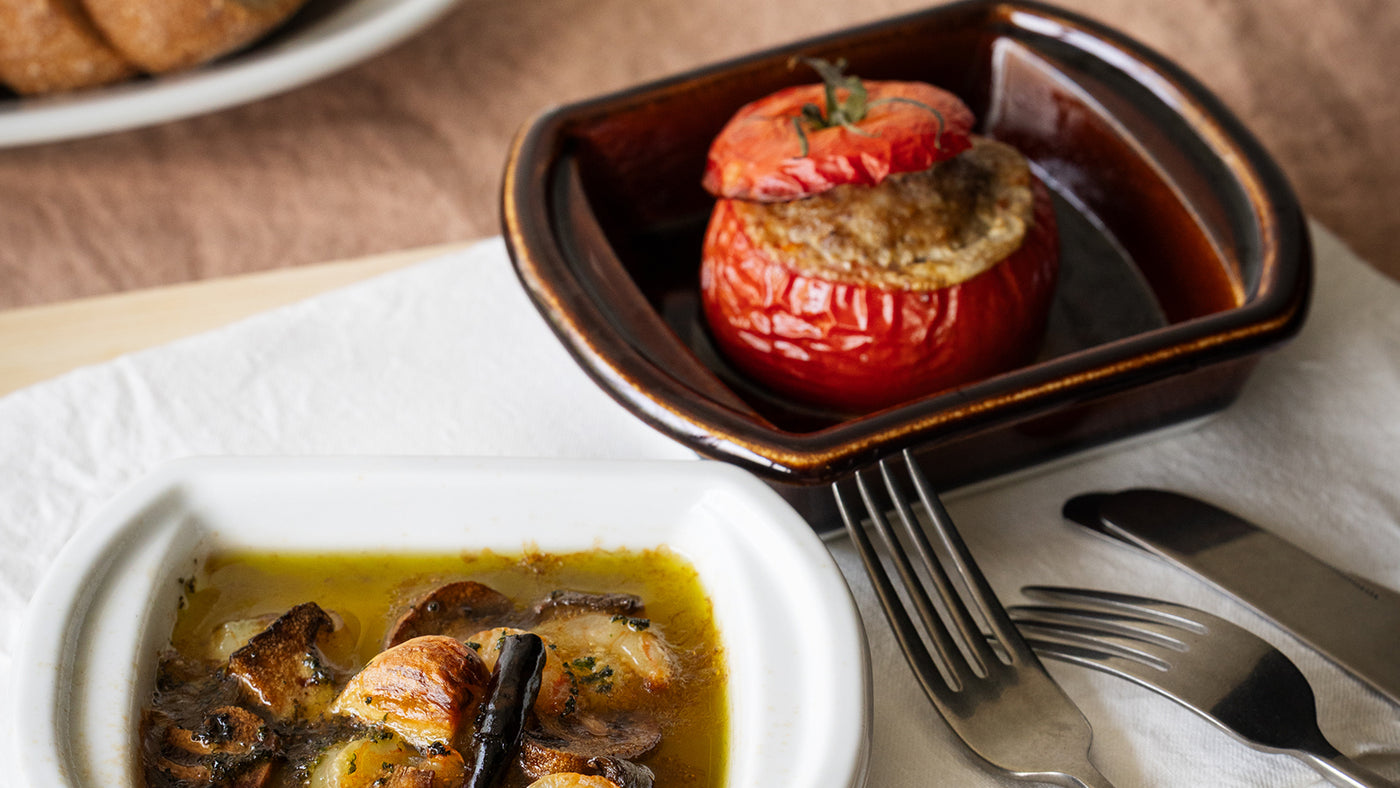 「Bakeware」は、オーブンや電子レンジで使える磁器製の角皿シリーズ。ぽってりとした厚みのある磁器は蓄熱性にすぐれ、料理をあたたかいまま保ってくれます。色は、清らかな〈白〉と、やわらかな光沢が美しい〈アメ色〉の2色。どちらも料理の色を引き立て、穏やかな存在感を放ちます。重ねて収納できる形や、持ち運びしやすいフォルムなど、使い勝手にも心配りが。シンプルでありながら、食卓に品のある印象を添えてくれます。