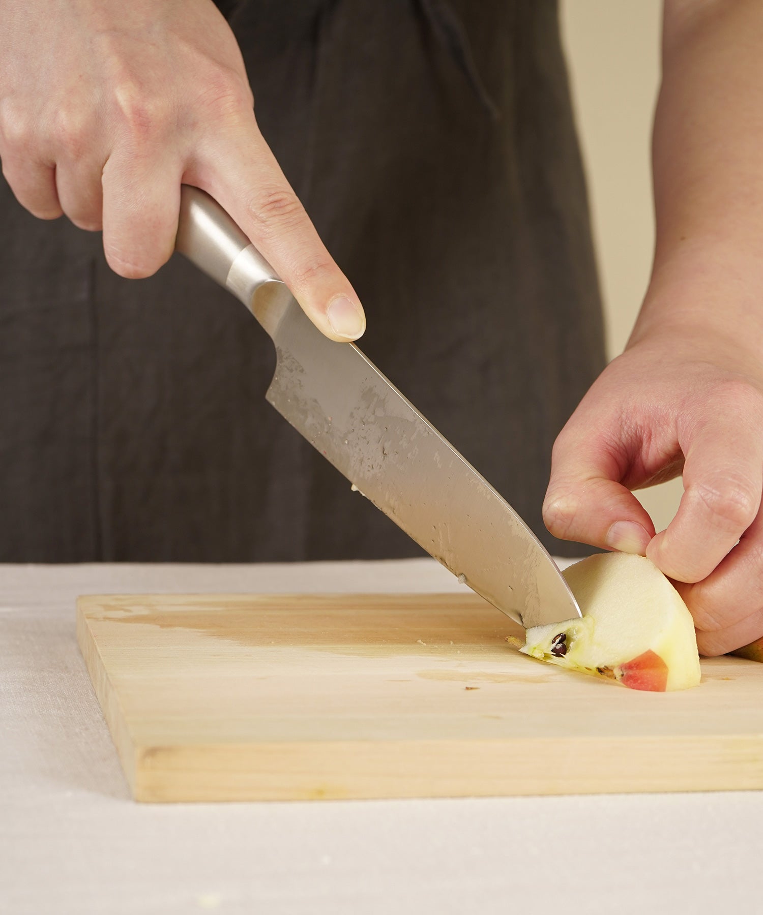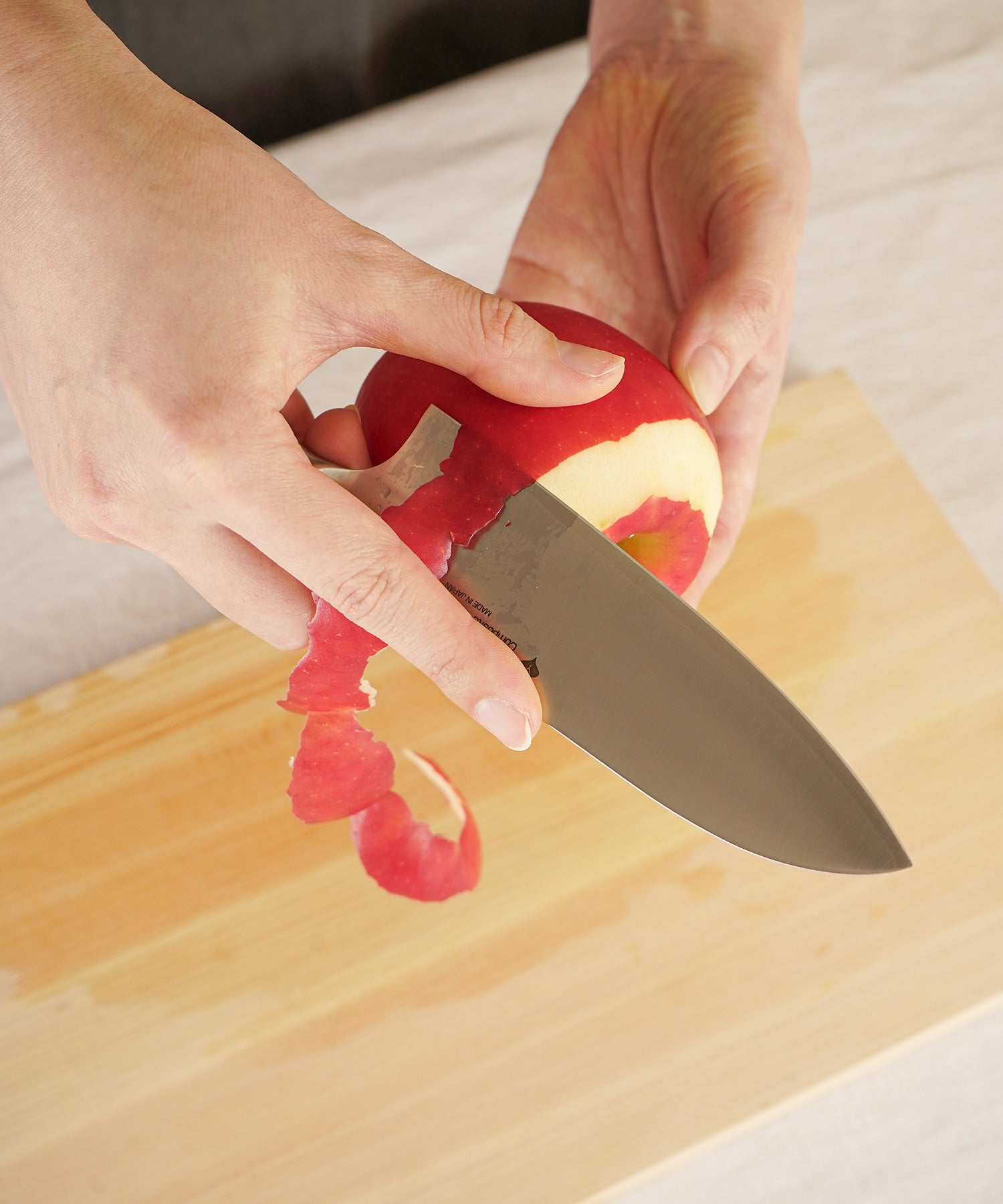 刃身には、モリブデン・バナジウムを添加した特殊ステンレス鋼を中心部に、粘り強い13クロームステンレスでサンドした三層鋼を使用。これは鋭い切れ味と折れにくさ、錆びにくさを併せ持つ刃物専用のステンレスで、熟練の職人により一本一本丁寧に本刃付けを行っています。