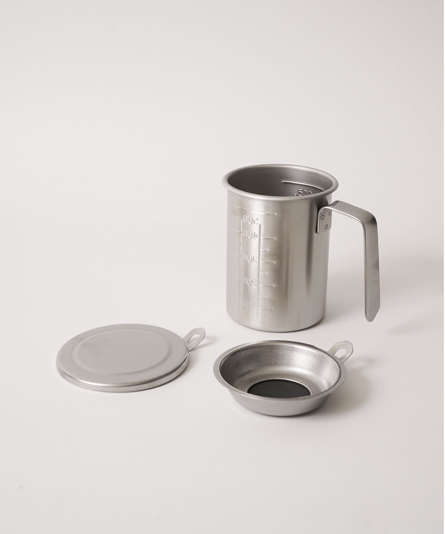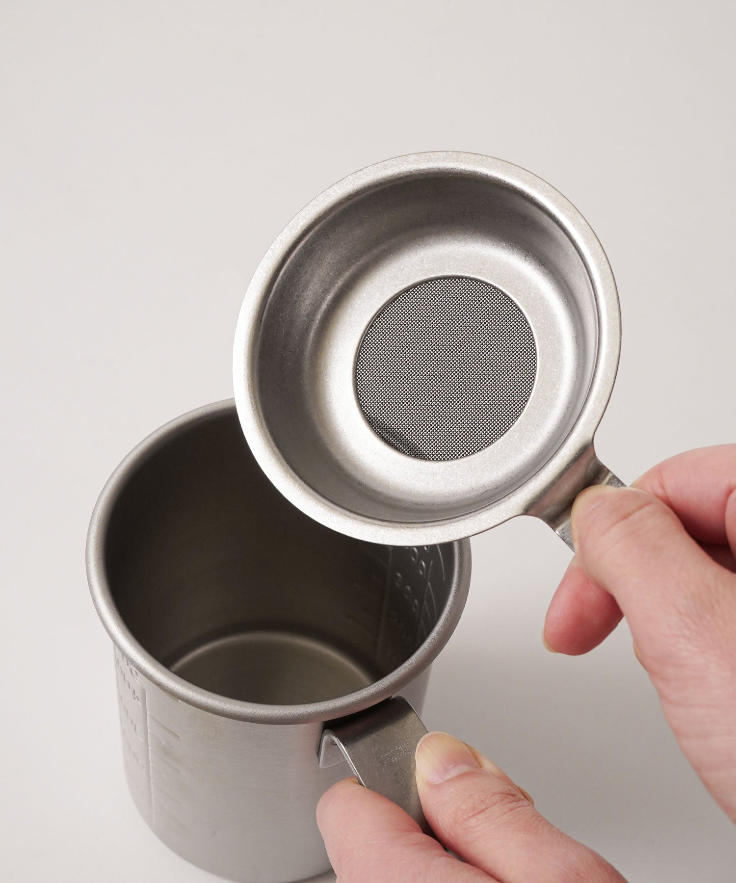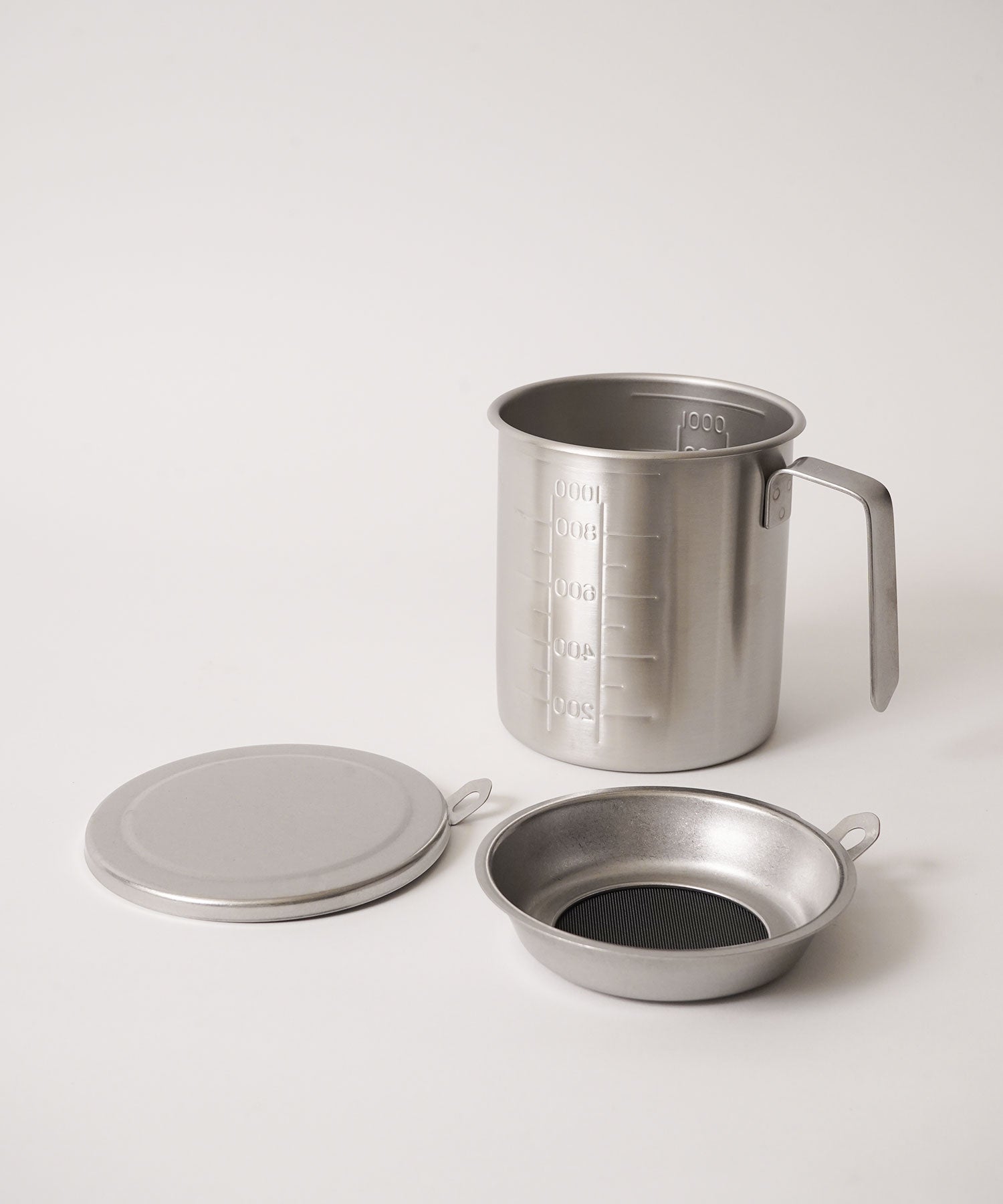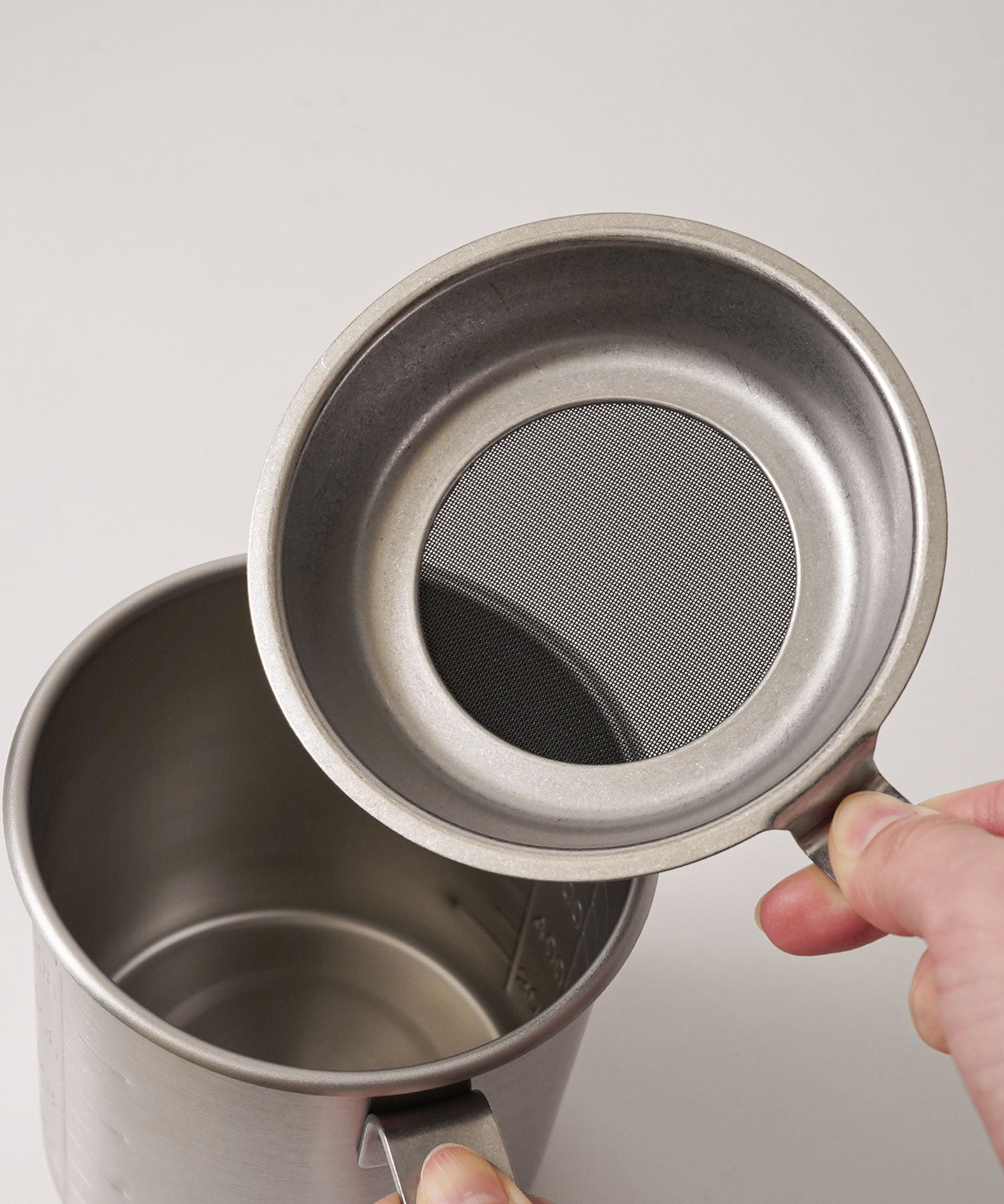 蓋、こしアミ、容器の3点セットのコンパクトなオイルポット。
