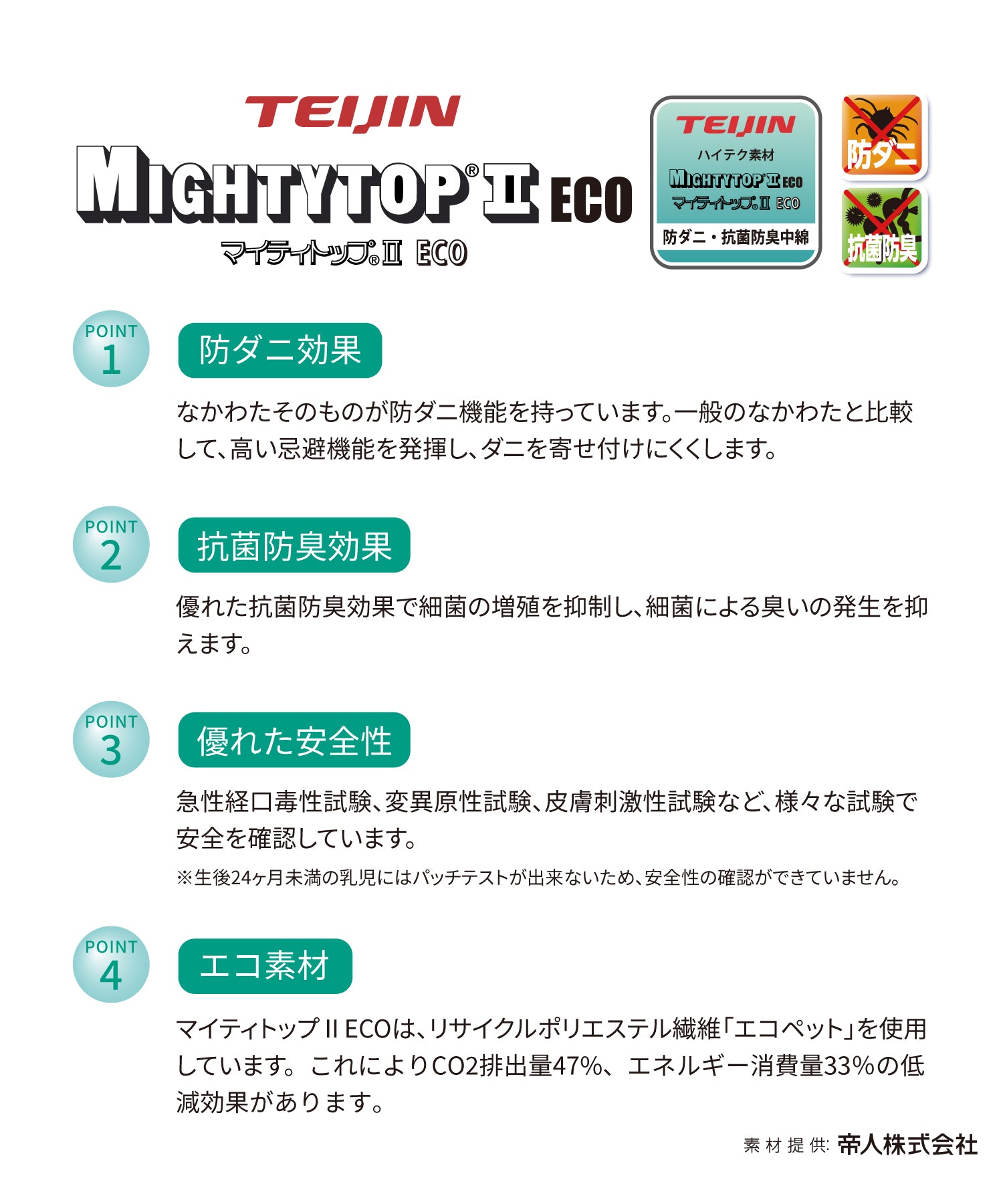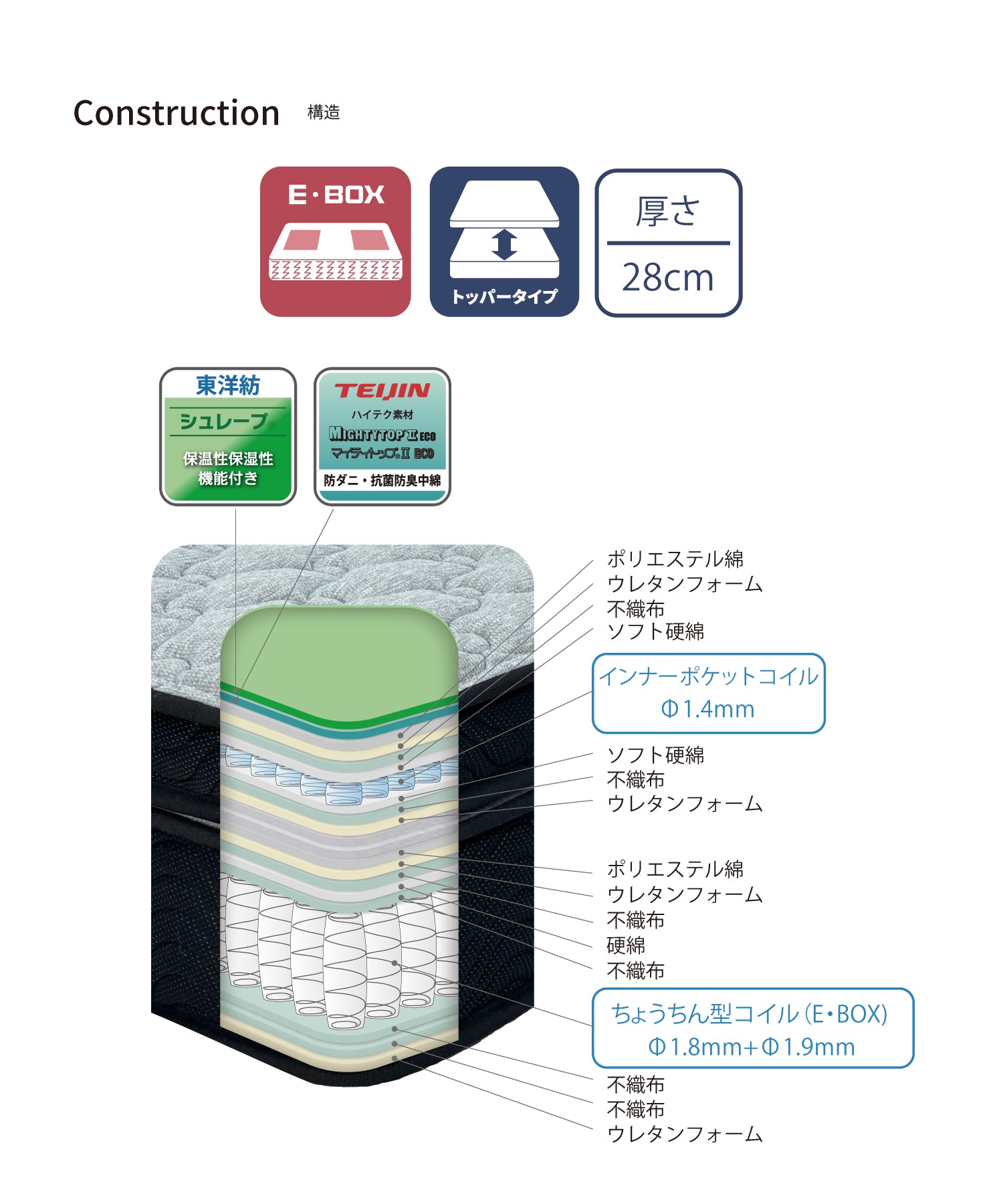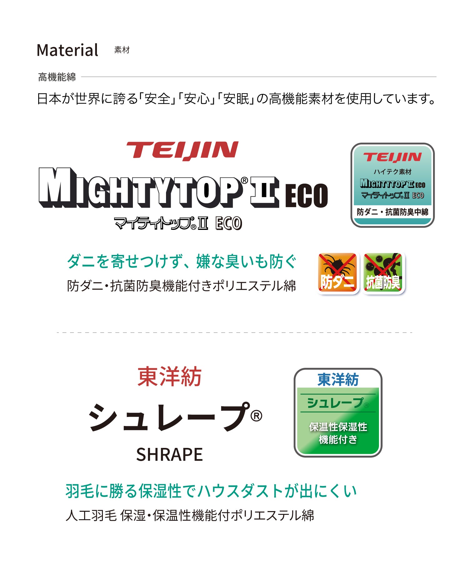 詰物:保温・保湿性機能付きポリエステル綿(東洋紡・シュレープ®)、防ダニ・抗菌防臭機能付きポリエステル綿(テイジン・マイティトップ®ⅡECO)、ポリエステル綿、不織布、ウレタンフォーム、硬綿、ソフト硬綿
