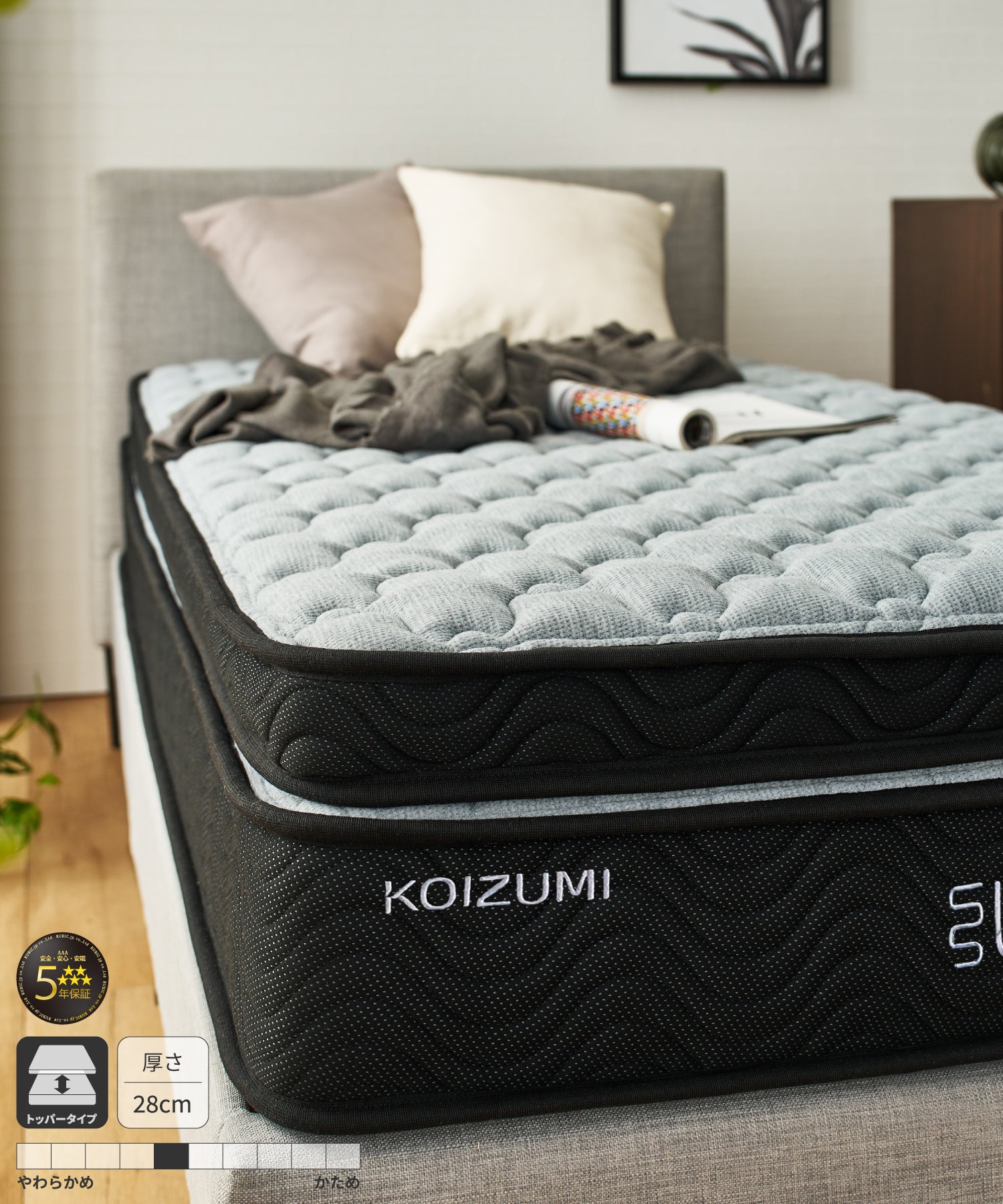 10cmのトッパーと18cmのボトムマットレスを重ねた贅沢な厚みが特徴で、機能性と安心感を兼ね備えた構造。