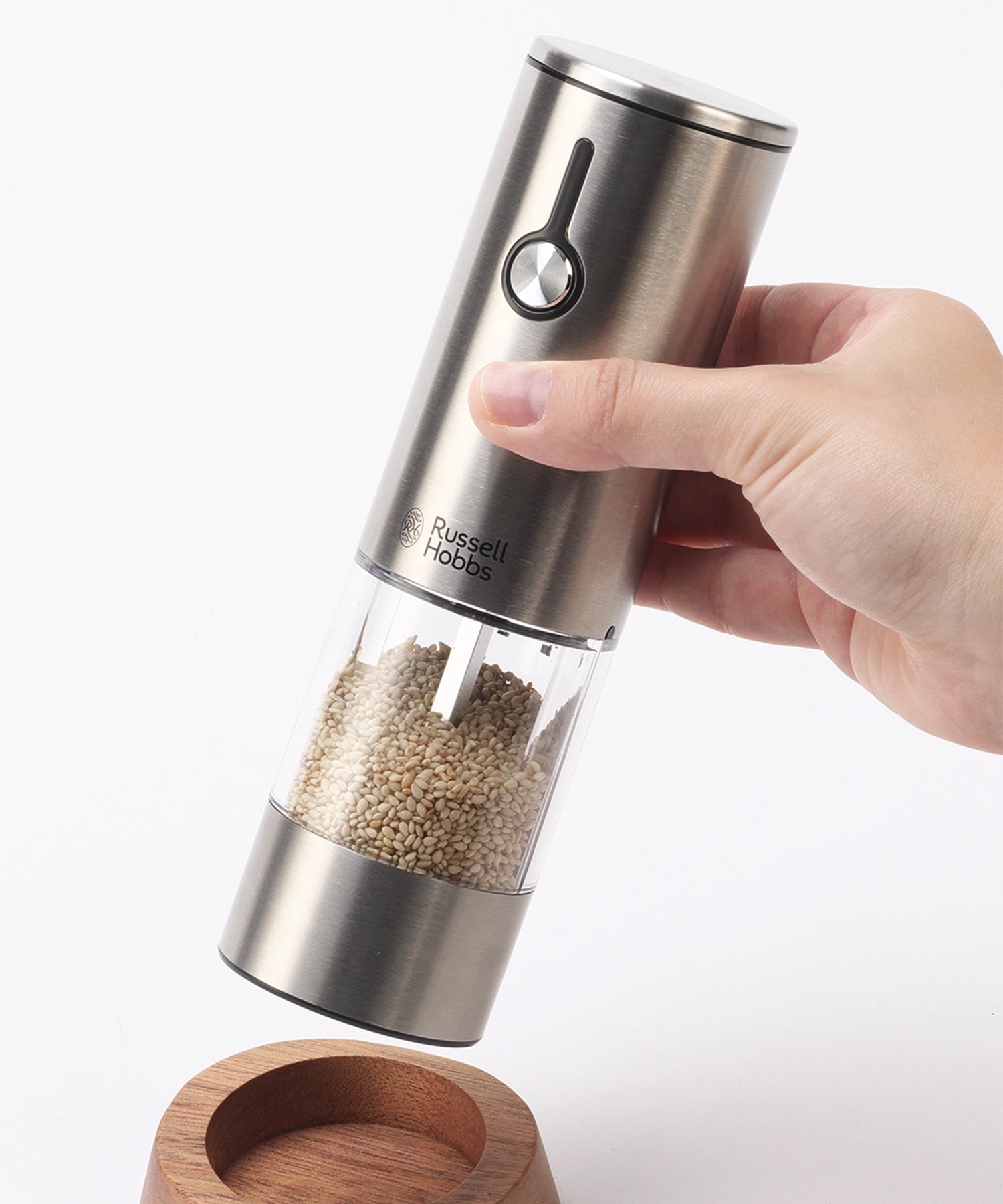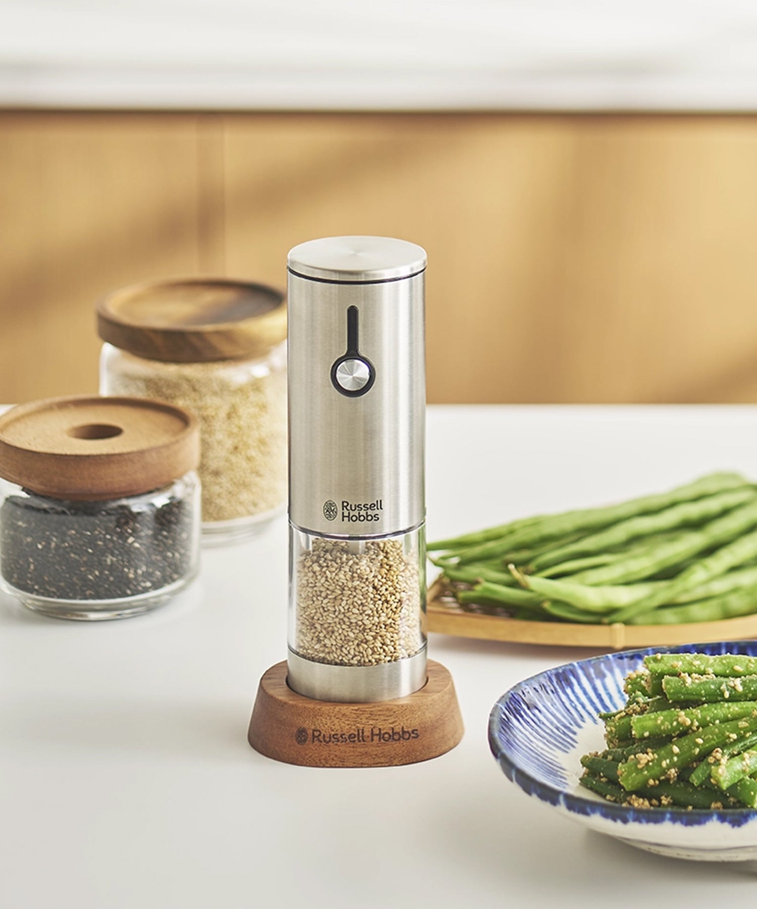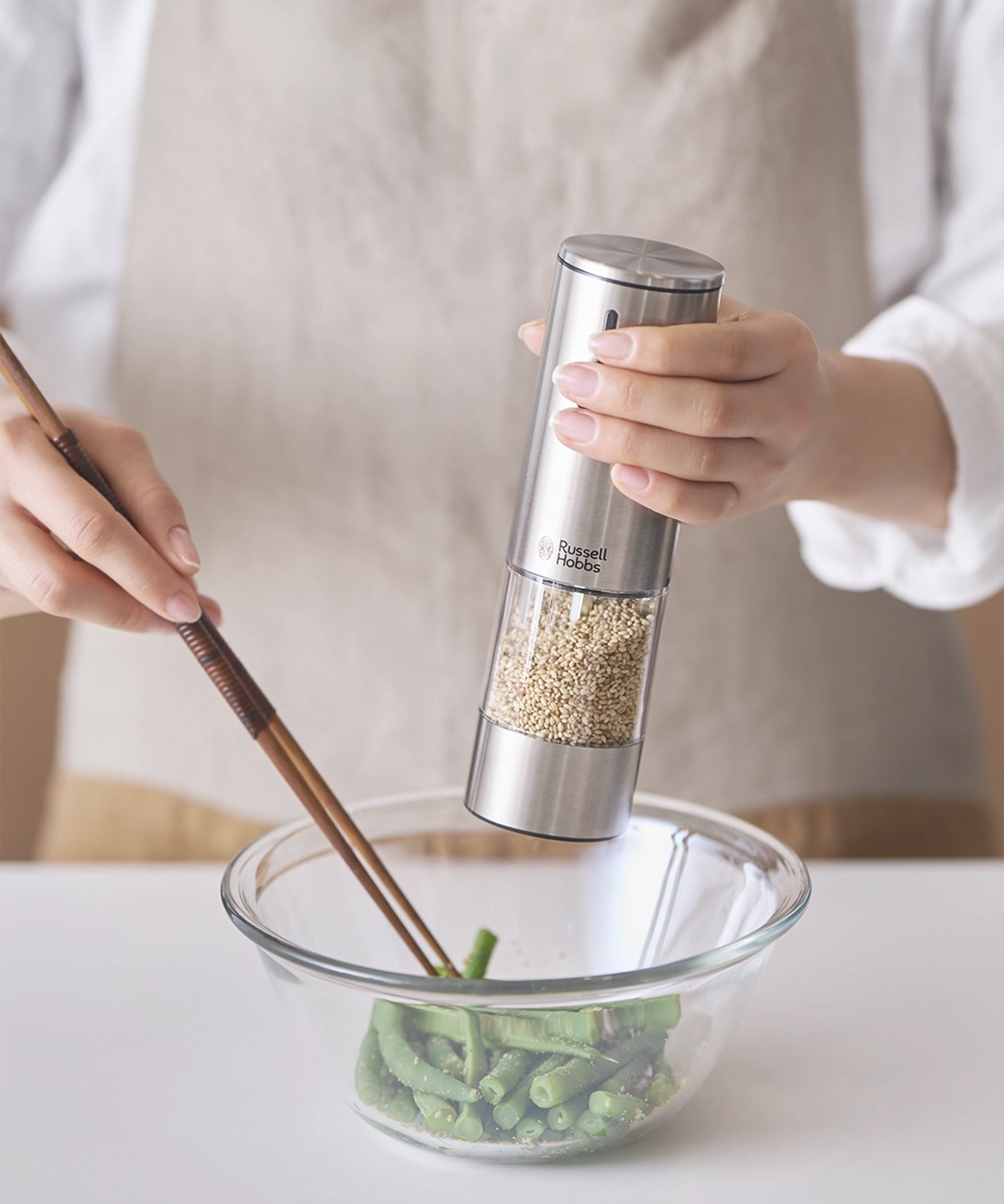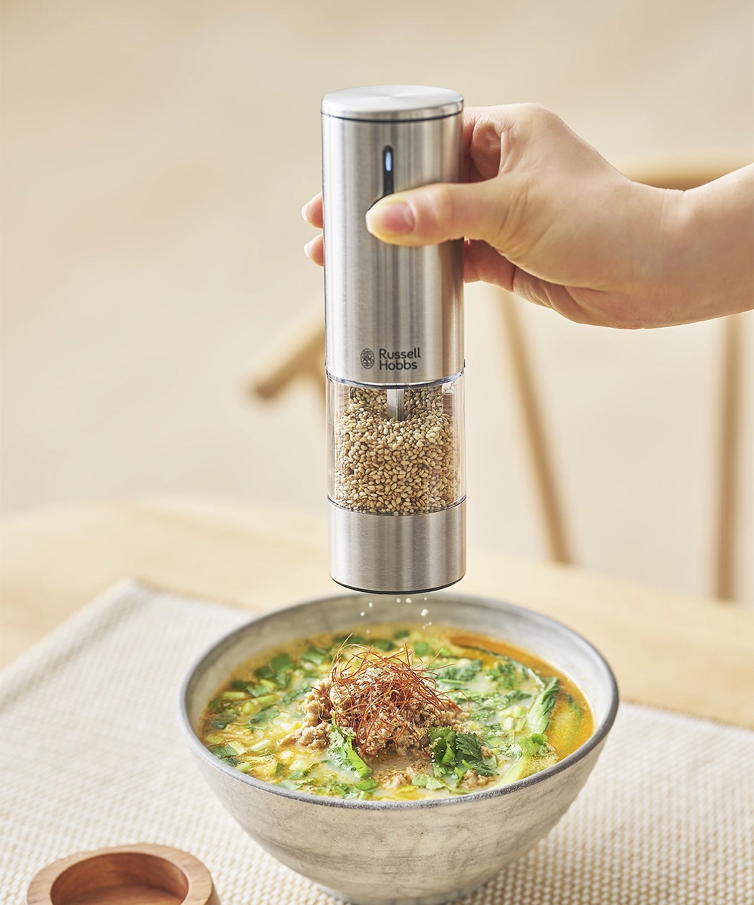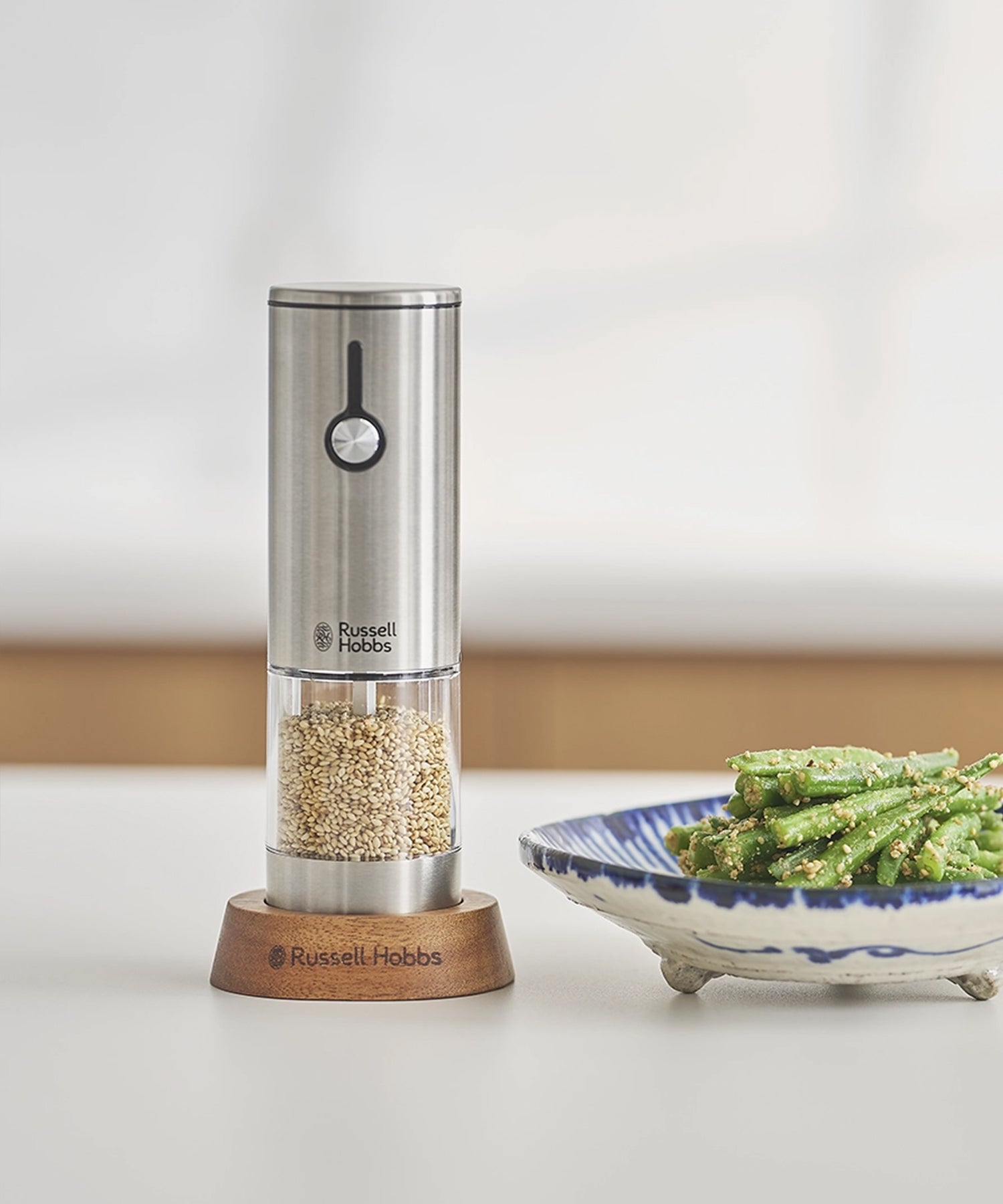 手動ですり鉢を使う場合と異なり、電動式なので片手で簡単に操作でき、料理中や食事中にも手軽に使えます。