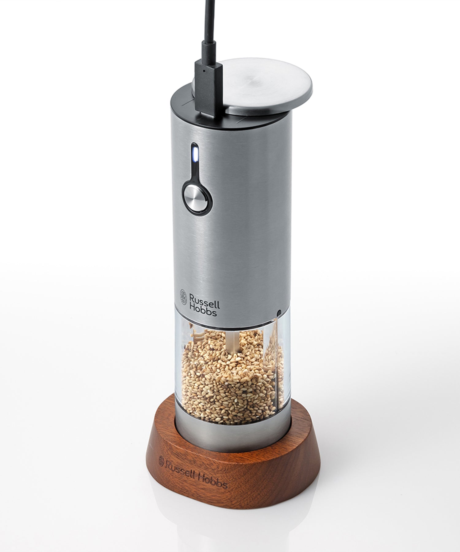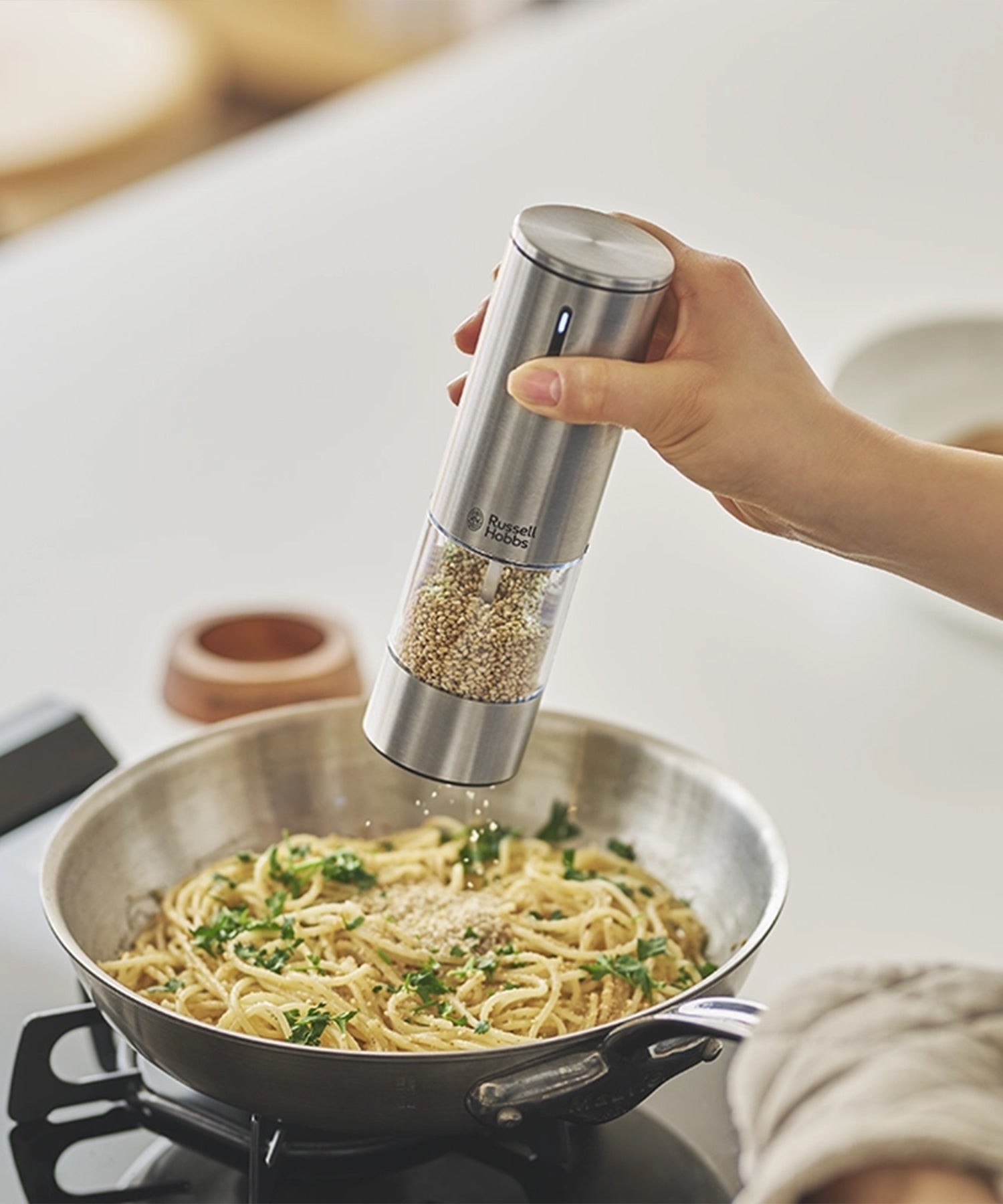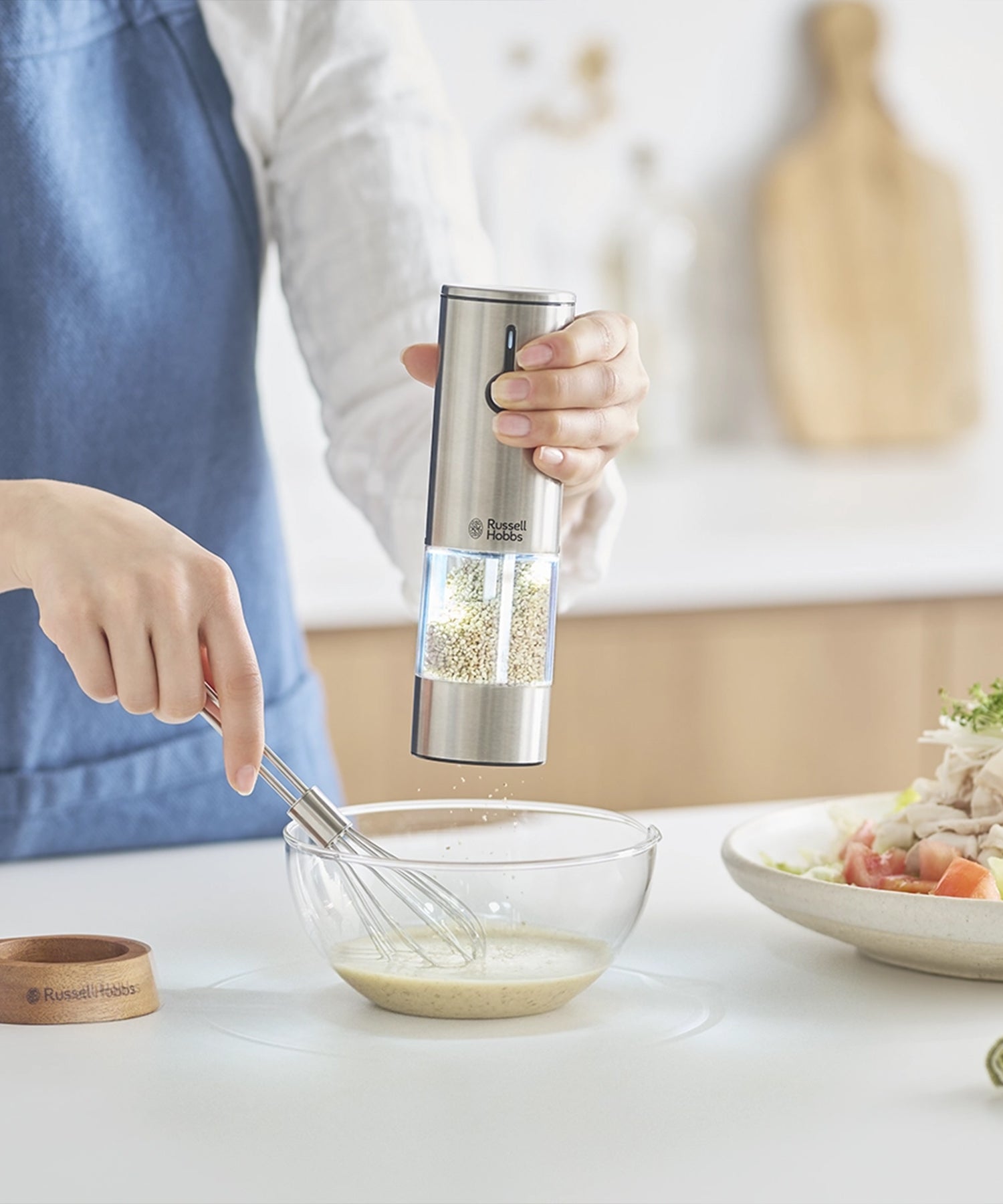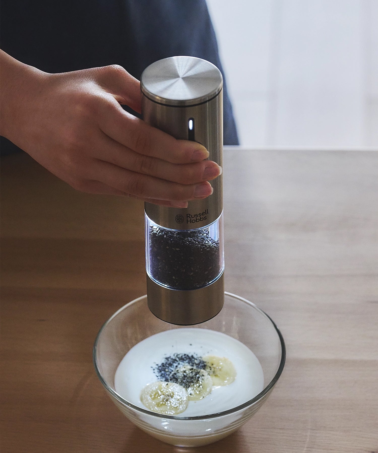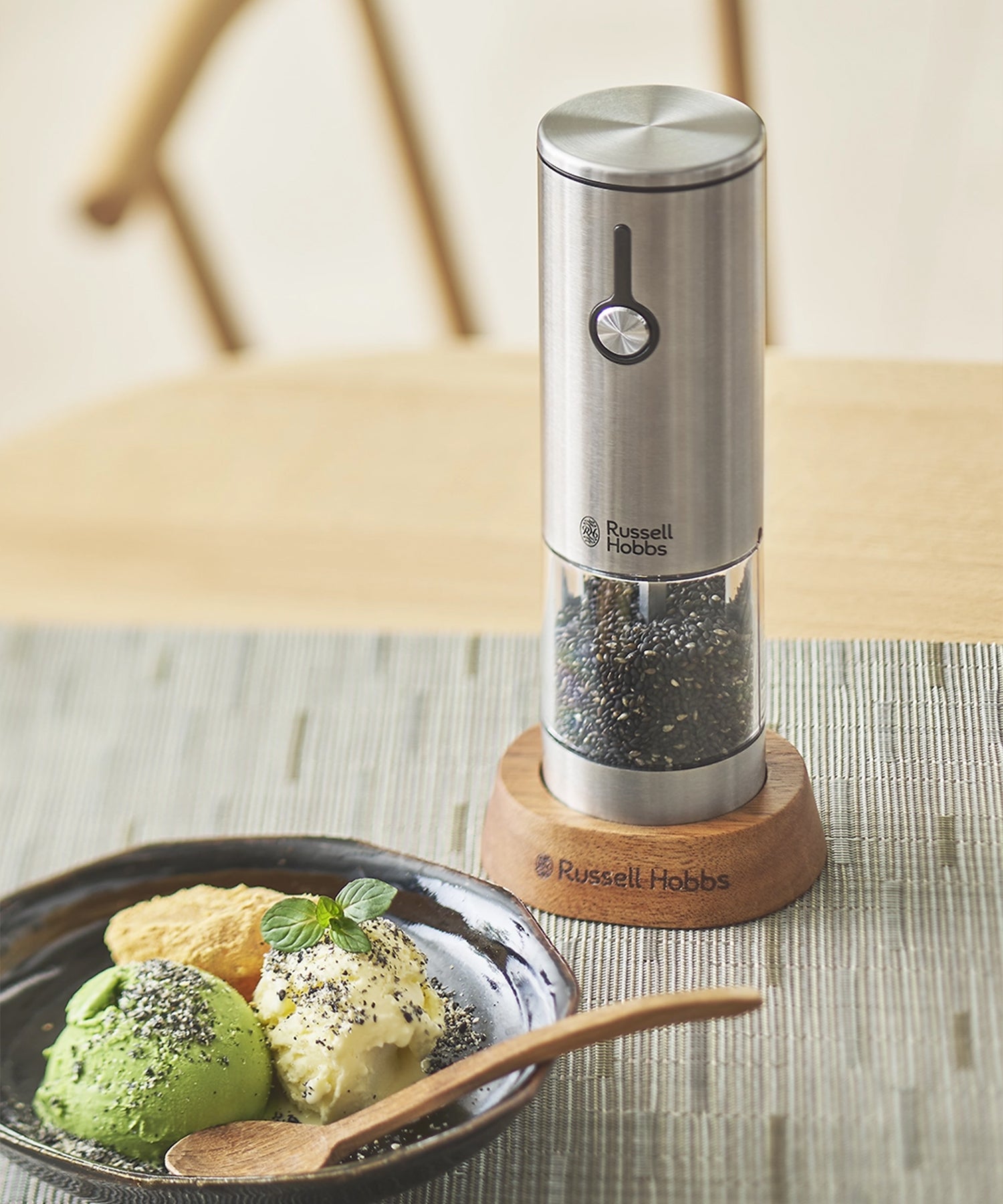 手動ですり鉢を使う場合と異なり、電動式なので片手で簡単に操作でき、料理中や食事中にも手軽に使えます。