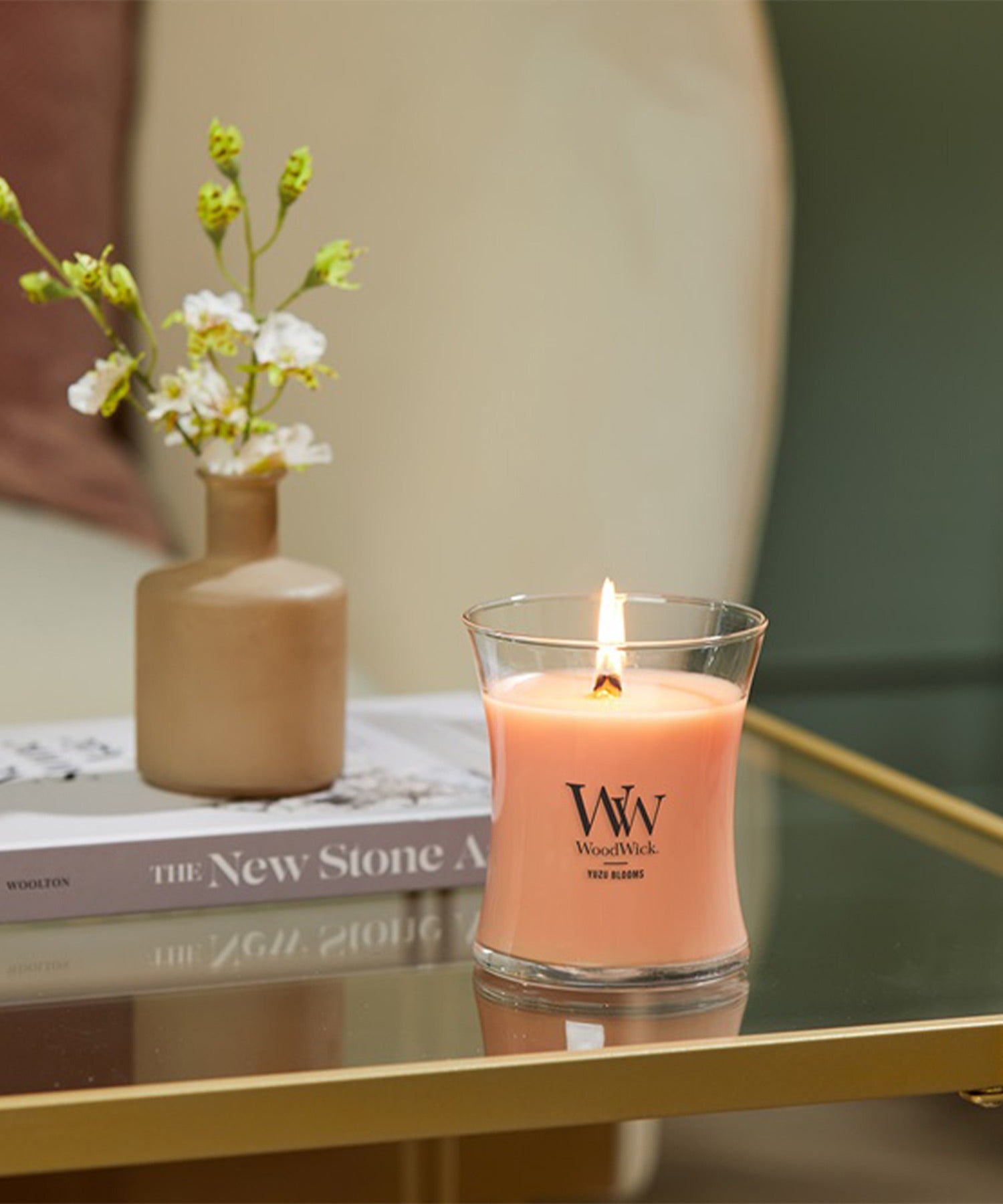 十字に配された木製芯に火を灯すと、暖炉やたき火のようにパチパチと音がするフレグランスキャンドル。