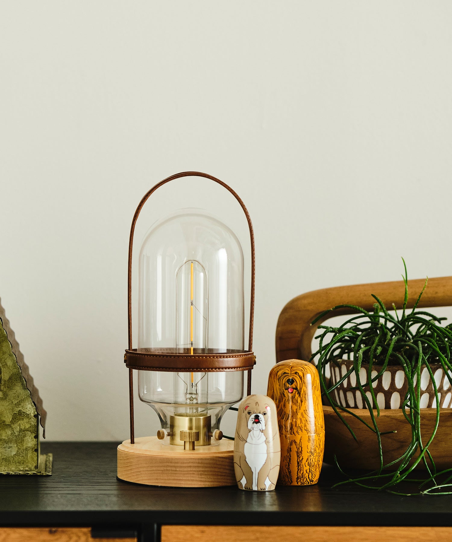 異素材を組み合わせた、シンプルでありながらも個性的なポータブルランプ。
