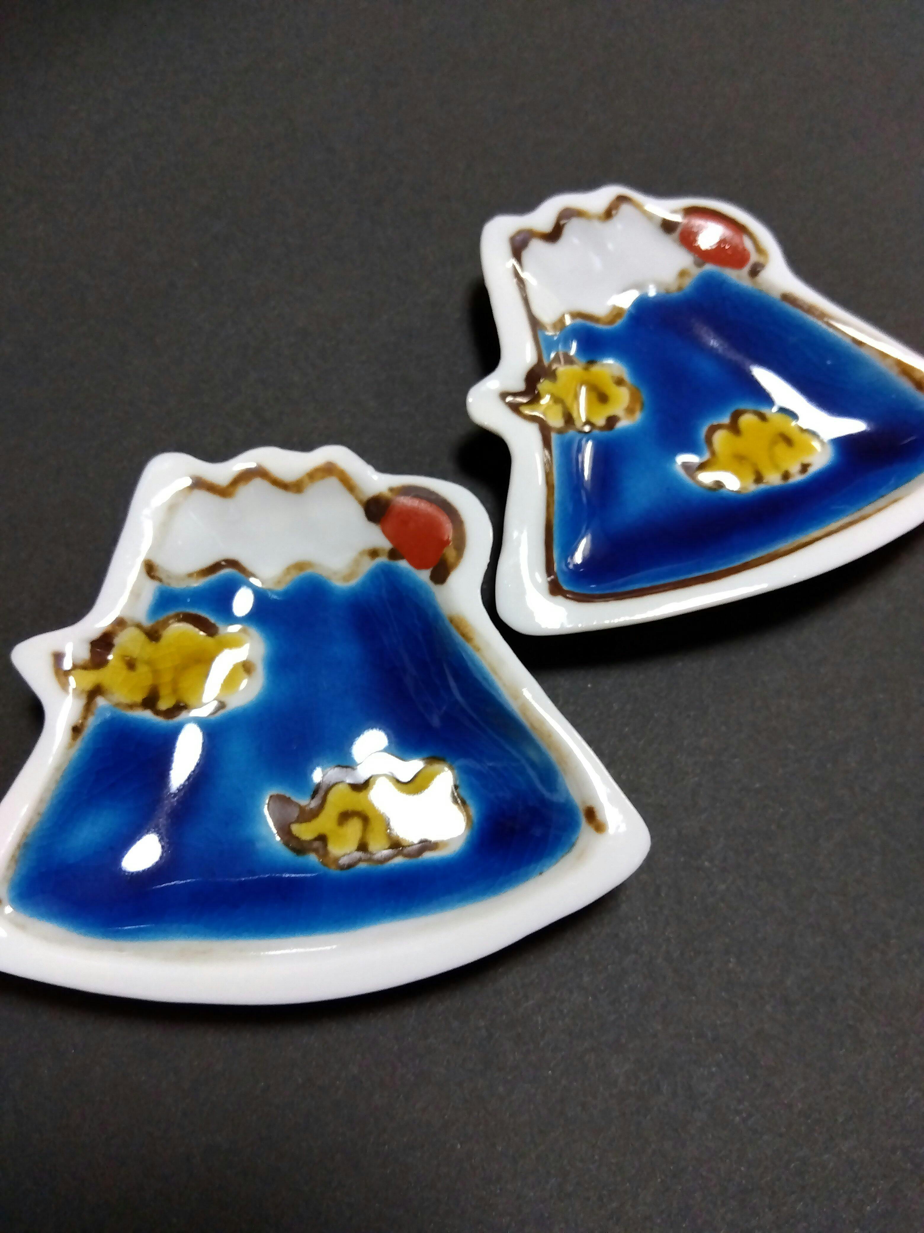 富士山や小槌、紅白椿などの縁起物をかたどり手書きで絵付けされた、なんともたのしい豆皿。