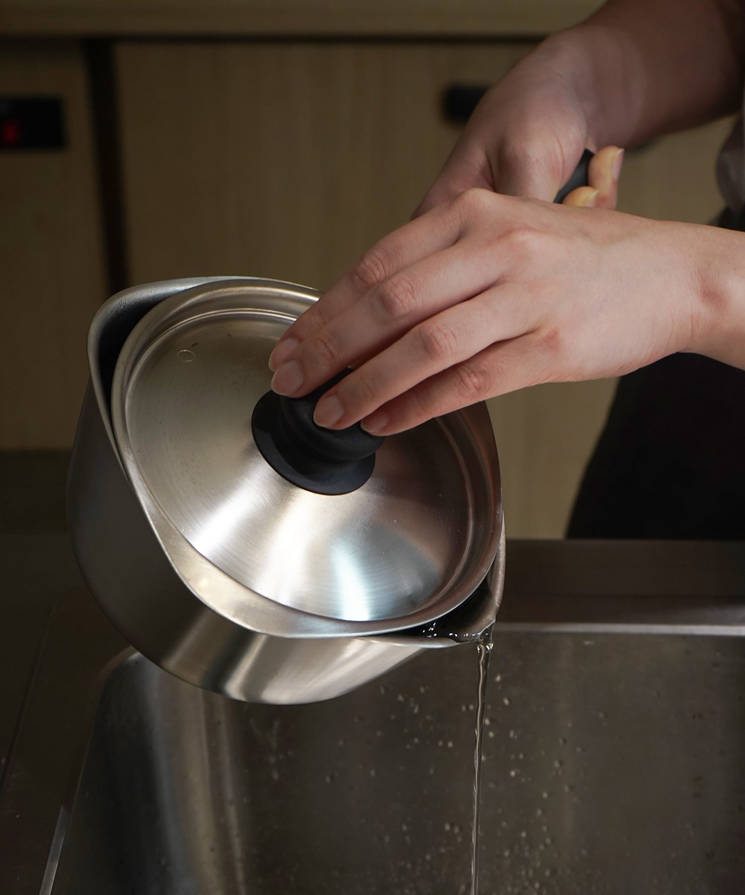 両側に注ぎ口があり、蓋を回転させることで本体との隙間を調整できるため、隙間を大きくして吹きこぼれを防いだり、蓋で中身を押さえながら煮汁を捨てることも可能です。