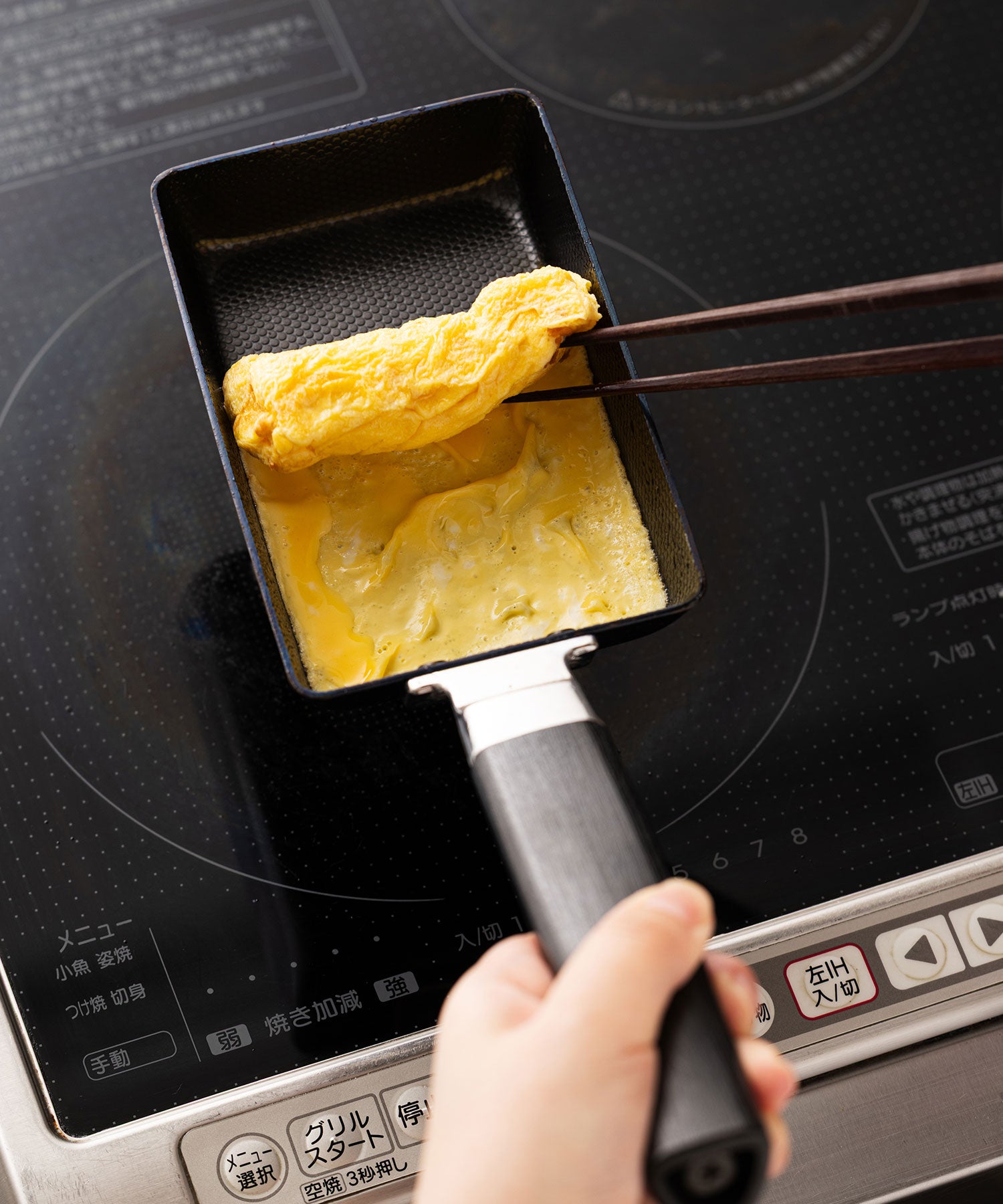 玉子焼きを巻きやすい絶妙な角度も特徴で、菜箸を差し込みやすく、巻き込みやすい設計。ふっくら上手に仕上がります。