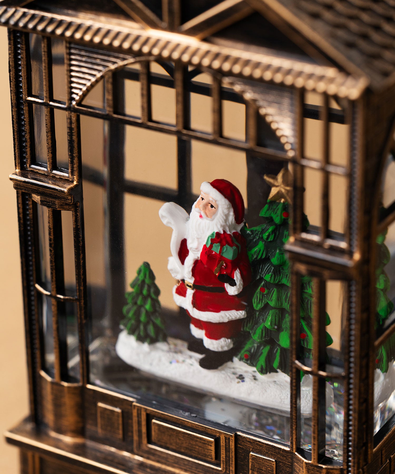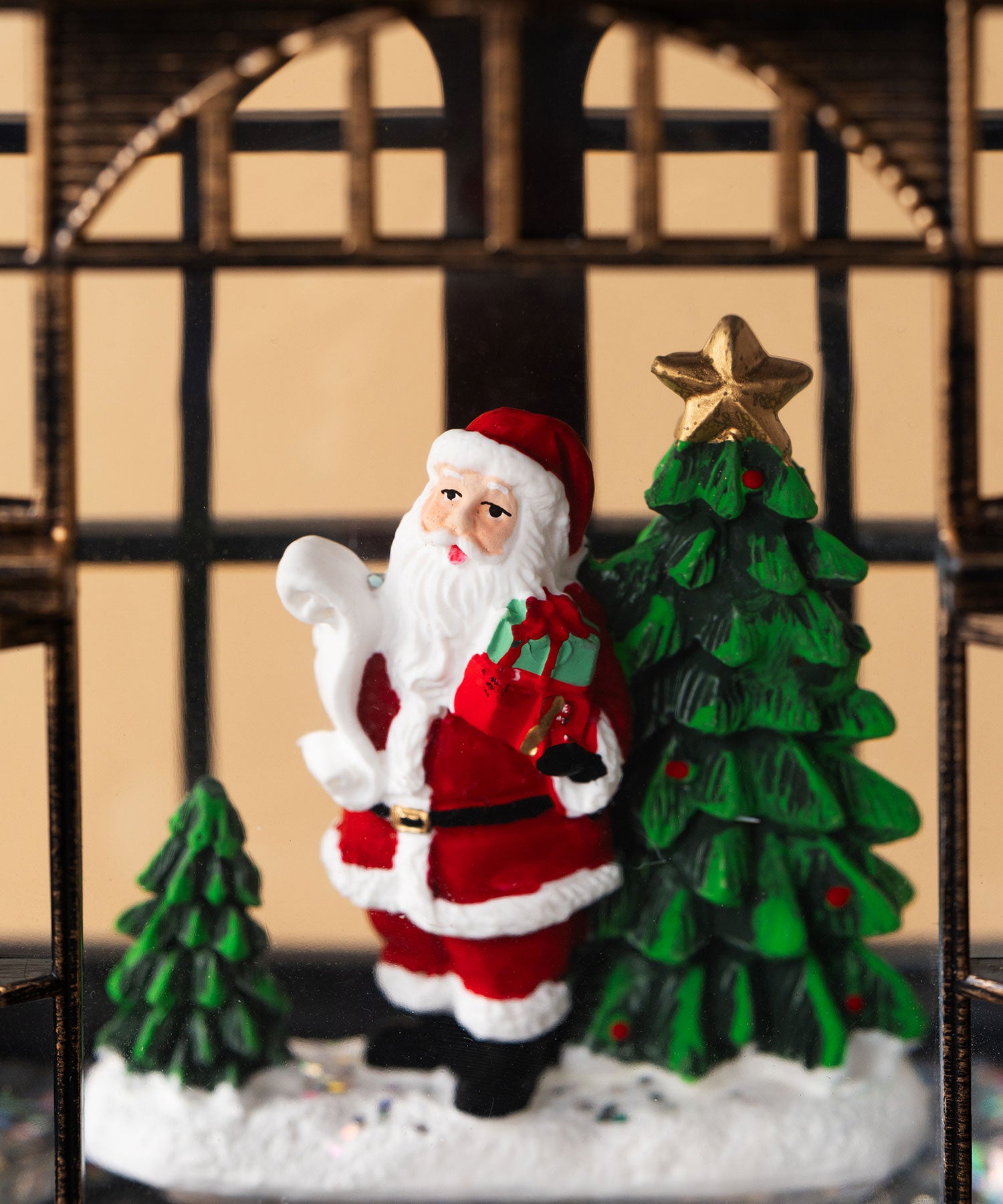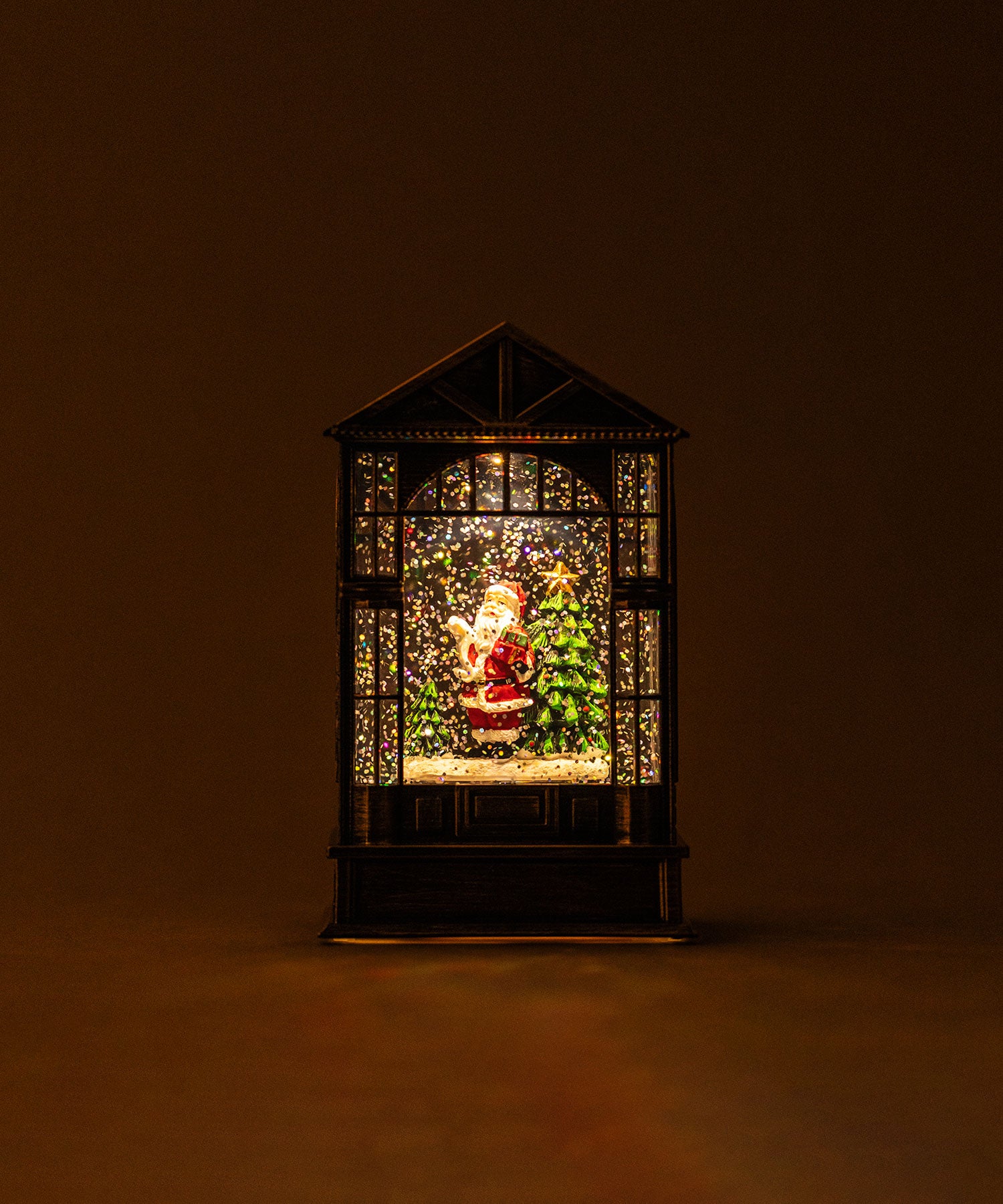 スイッチのON/OFFにより、優しく微笑むサンタクロースがライティングされ、可愛らしいクリスマスソングと共に雪が舞います。